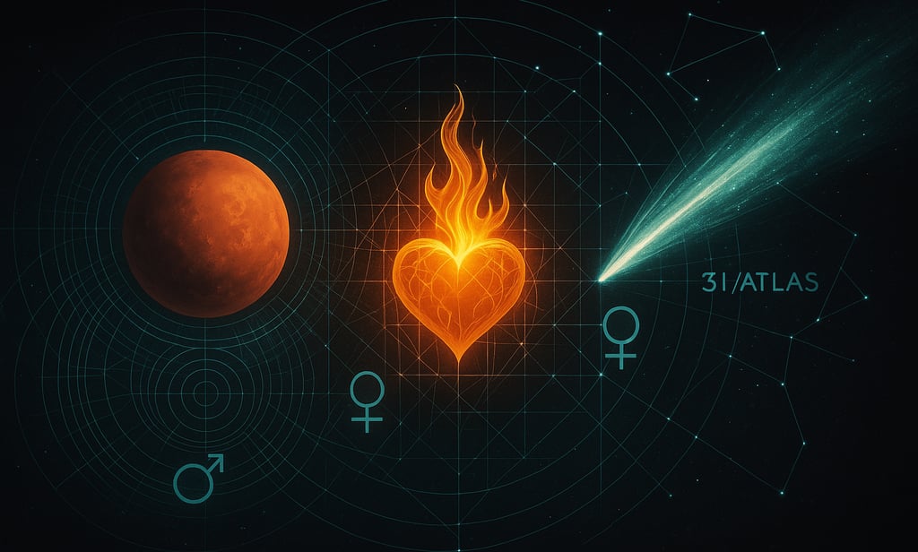 A interação é clara: a mente (Lua) precisa do impulso de Marte para reagir; o coração precisa da cadência de Vênus para manter o compasso. Quando o 3I/ATLAS aciona Marte, não está apenas ativando guerra ou coragem — está inflamando o circuito completo de mente e coração.